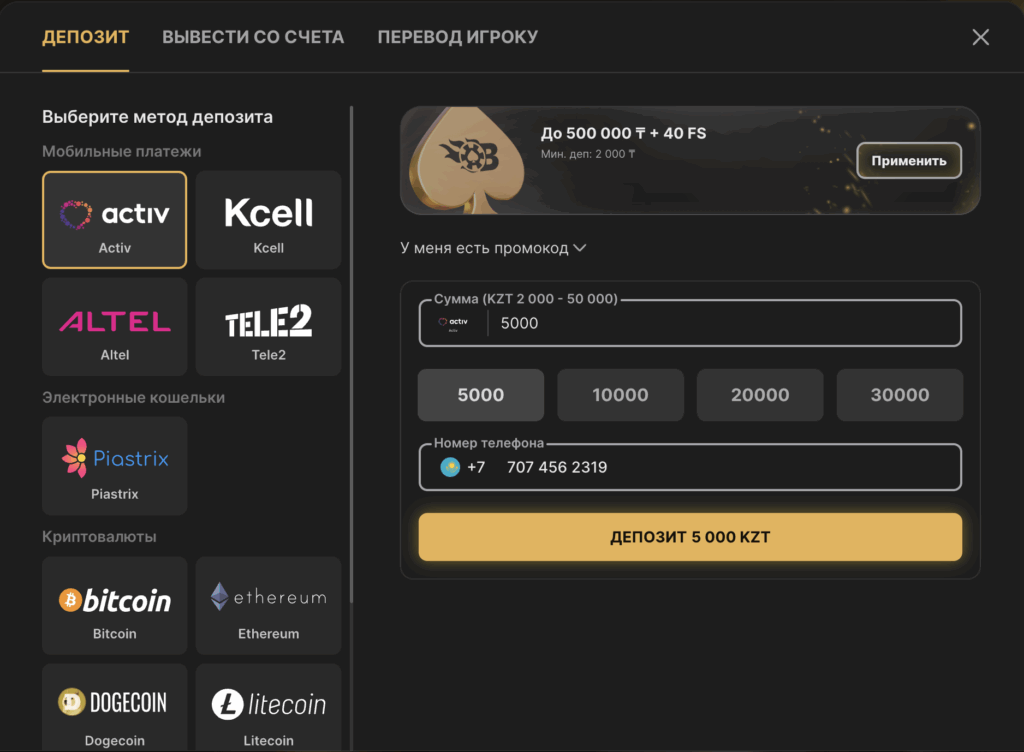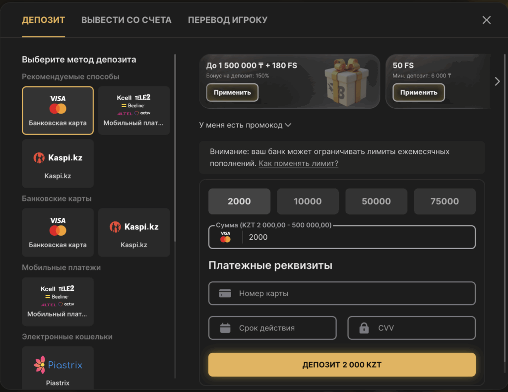 Депозит от 2 000 KZT, вывод от 4 000 KZT.